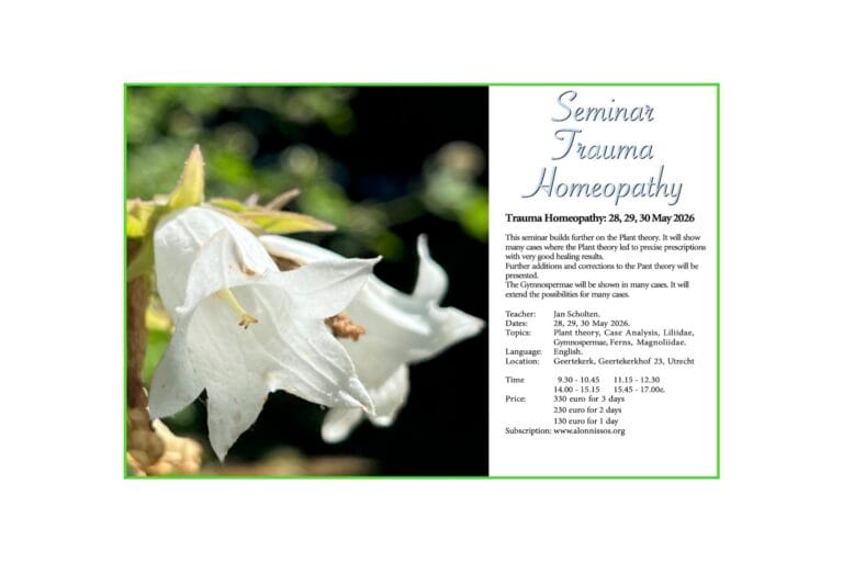 The plant theory shows its value daily in practice. It is always wonderful to see how difficult problems and diseases get healed and how people feel their old selves again. Further additions and corrections to the Pant theory will be presented. This gives more remedies and more refined pictures.