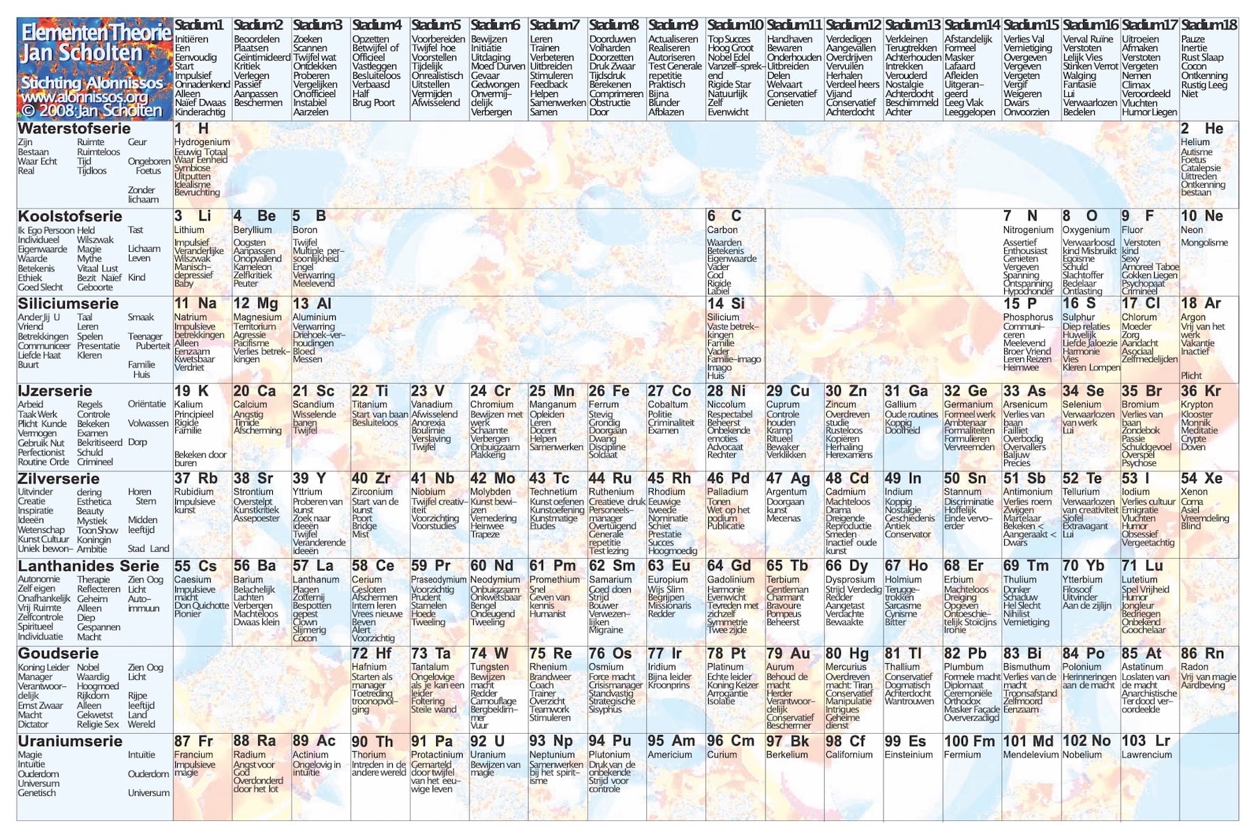 De Elementenkaart toont de sleutelwoorden van de Elementen, de Rijen/Reeksen en Kolommen/Fasen van het periodiek systeem.